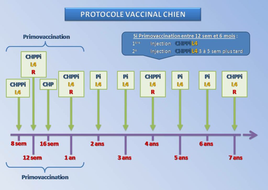 Pour les vaccins qui se font par injection sous-cutanée  : les chiens doivent être âgés d’au minimum 4 semaines ; La primo-vaccination consiste en 2 injections espacées de 2 à 3 semaines ; La protection dure 1 an, il est donc nécessaire de réaliser un rappel tous les ans.